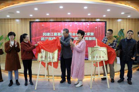 李海波、陈传忠、左晖、丁玲、胡静共同为民建江夏区委员会“会员之家”暨武汉民建企业发展促进会江南基地进行了揭牌。