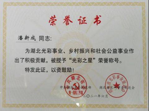 在中国共产党成立100周年之际,湖北省于5月31日召开了“万企兴万村”现场推进会暨助力民族地区发展光彩事业宜昌行大会,中共湖北省委、省委统战部、省工商联、省民宗委、省光彩事业促进会等主要领导出席会议。会上表彰了为湖北光彩事业、乡村振兴和社会公益事业作出积极贡献的民营经济人士,民建武汉市直综合支部会员、博大集团董事长潘新成被授予湖北“光彩之星”荣誉称号。