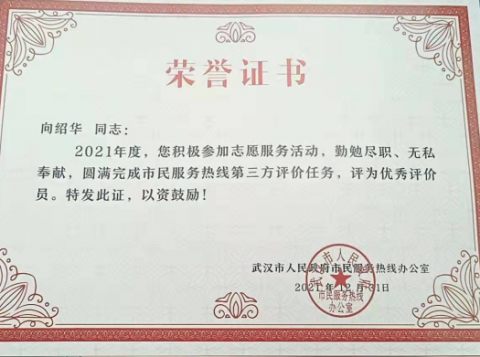 近日,恩施民建会员向绍华荣获武汉市政府市民热线办公室颁发的年度“优秀评价员”荣誉称号。