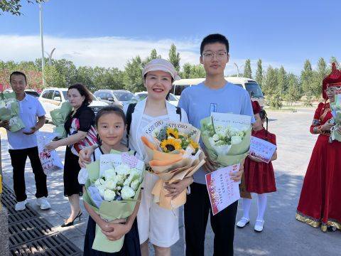 7月31日下午,在新疆阿拉山口机场门口,一位个子高大的男孩抱着一束鲜花,眼睛直盯着出口通道。