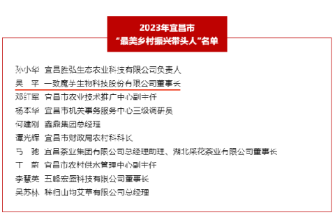 为树立先进典型,凝聚强大精神动力,培育和践行社会主义核心价值观,继承和发扬“上下同心、尽锐出战、精准务实、开拓创新、攻坚克难、不负人民”脱贫攻坚精神,进一步动员社会各界力量积极参与巩固拓展脱贫攻坚成果、全面推进乡村振兴。,9月22日,由宜昌市委宣传部、市文明办、市乡村振兴局联合组织开展的2023年宜昌市“最美乡村振兴带头人”选树活动结果揭晓,宜昌市民建企业家协会副会长、湖北一致魔芋生物科技股份有限公司董事长吴平等10人当选“最美乡村振兴带头人”。