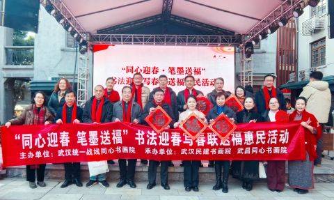 1月17日下午,由民建武汉市委会和武汉市中华文化学院指导,武汉统一战线同心书画院主办,武汉民建书画院与武昌同心书画院承办的“同心迎春,笔墨送福”书法迎春暨民建“会员之家”揭牌活动,在历史文化底蕴深厚的昙华林成功举办。民建武汉市委会专职副主委徐莉、秘书长徐敏、武昌区委统战部副部长陆峰应邀出席活动,武汉民建书画院院长游义云、副院长方静、秦元昌、胡馨予、秘书长秦景阳、副秘书长戴竹参加活动。
