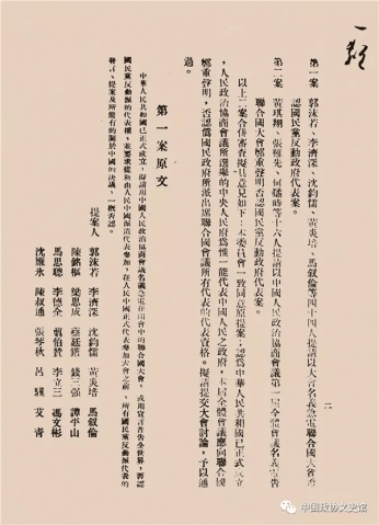 黄炎培等人联名提出的人民政协的第一号提案——《请以大会名义急电联合 国否认国民党反动政府代表案》