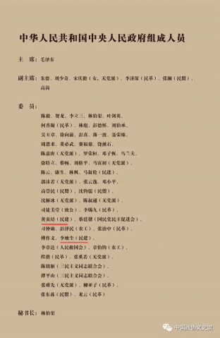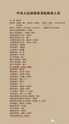 各民主党派和无党派民主人士参加了人民政府的领导工作。在6名中央人民政府副主席中,有非中共人士3人;在56名委员中,有非中共人士27人。在4名政务院副总理中,有非中共人士 2人;在15名政务委员中,有非中共人士9人。在政务院34个部、会、院、署中,担任正职的非中共人士有14人;还有一些非中共人士担任副部长和地方人民政府的领导职务。