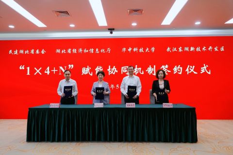 刘运梅对省委统战部的精心指导和各参加单位的鼎力支持表示感谢。她指出,民建省委、省经信厅、华中科技大学和武汉东湖新技术开发区签订“1×4+N”赋能协同合作协议,是民建湖北省委和各参加单位深入贯彻落实《全省统一战线“同心聚力建支点”行动方案》的重要举措,更是我们以更高的履职能力服务湖北高质量发展、助力中部地区崛起重要战略支点建设的关键一步。她强调,一是提高政治站位,充分认识建立“1×4+N”赋能协同机制的重大意义。探索建立“1×4+N”赋能协同机制,集智聚力在服务国家和湖北重大战略、开展重点课题研究、实现信息资源共享、培养党外高层次人才等方面加强协商沟通协作,是我省统一战线紧跟时代步伐、顺应实践要求,发挥人才智力和资源优势的一项重要举措,标志着统战成员参政履职又有了新的平台,对于深入推进协商民主,更好地服务中心工作,促进科学决策,助推科技成果转化,彰显统一战线优势和作用具有十分重大的意义。二是强化责任担当,通过“1×4+N”赋能协同机制聚力推进湖北支点建设。我们建立“1×4+N”赋能协同机制的主要目的,是为了搭建一个开放型、兼容型平台,发挥1×4的聚变效应,和各参加单位一道,结合各自专长、工作实际和现实需求,发挥优势,实现权威数据的准确提供、企业案例和素材精准支撑,专家学者和业务骨干高效联合,汇智聚力共同破解国家和湖北经济社会发展中的重点难点问题,提升建言资政成果质效,为省委省政府施政决策提供参考;多渠道向上呼吁,为湖北争取更多国家支持;推动各类调研(科研)成果的转化应用;加强高层次人才和干部队伍的实践锻炼,积极拓宽党外高层次人才发展和培养渠道,聚力推进湖北支点建设。三是聚焦中心大局,力争通过“1×4+N”赋能协同机制结硕果创佳绩。以习近平新时代中国特色社会主义思想为指导,紧紧围绕党中央和省委省政府重大战略部署以及湖北支点建设的“两步走”目标任务和七大战略举措,聚焦“持续推动‘支点建设’取得新的更大进展”“‘十五五’规划和2026年经济工作”等重点课题深入开展调查研究,提升建言资政成果质效,适时举办主题论坛和开展特色活动等,力争通过“1×4+N”赋能协同机制结硕果创佳绩,用高质量建言助力湖北在新征程中破局突围、勇当标杆,为加快建成中部地区崛起重要战略支点贡献更多智慧和力量。