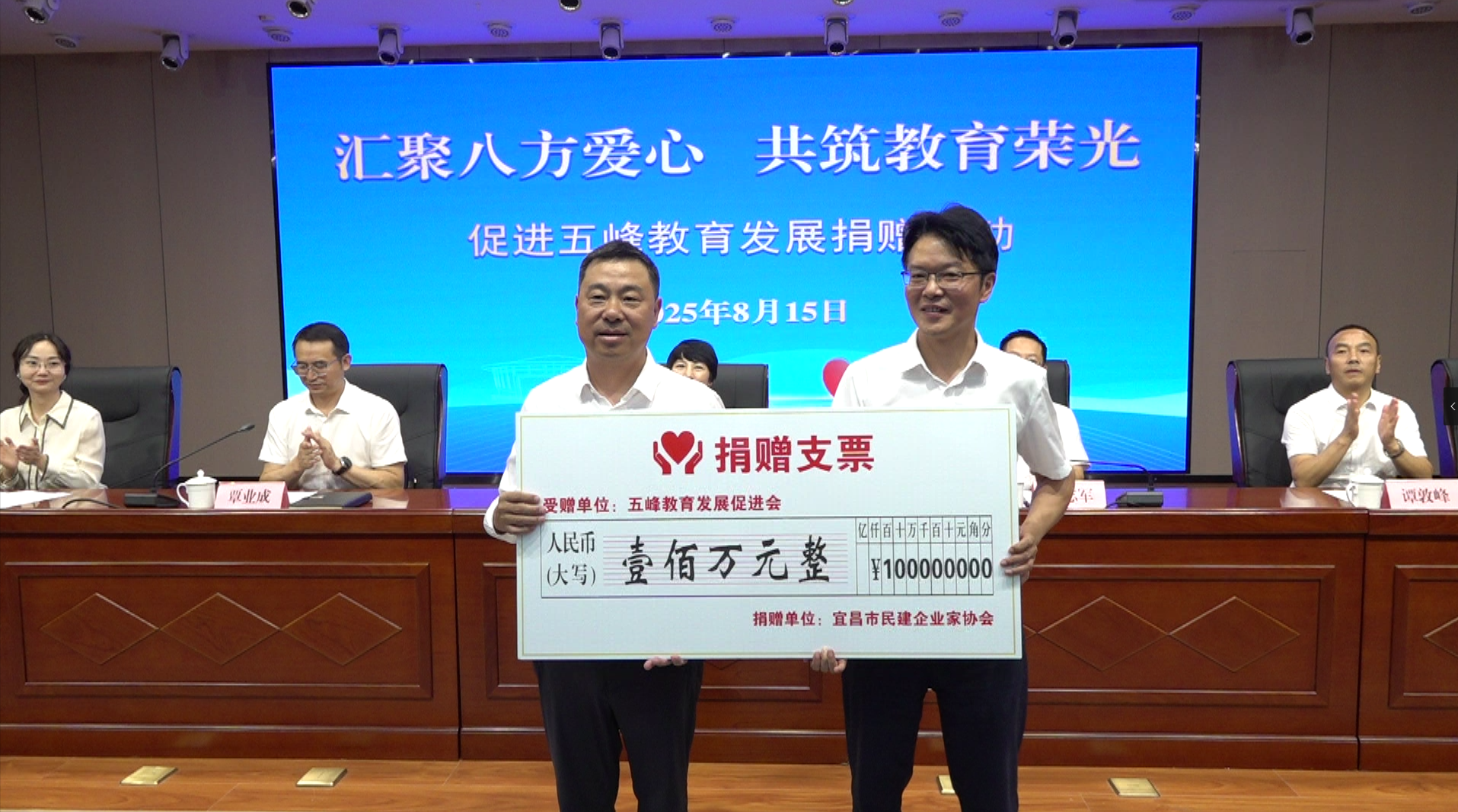 活动中,宜昌市民建企业家协会、兴发集团、安琪集团分别向五峰教育发展促进会捐赠教育基金100万元、50万元、50万元。五峰县将以“优劳优酬、激励先进、促进发展”为宗旨,将基金用于表彰在教育教学一线辛勤耕耘、贡献突出的优秀学校、校长、教师及教育工作者,奖励优秀学生。