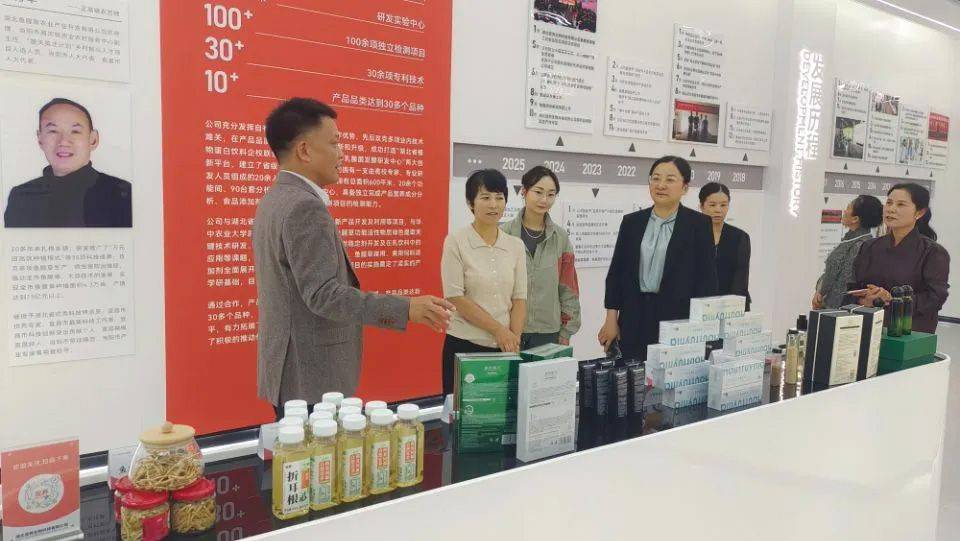 在湖北宜养生物科技有限公司,张琼一行参观了鱼腥草智慧大棚、生产车间各类饮品加工线和产品展示。当得知企业将传统药材鱼腥草与现代健康理念巧妙结合,既传承了地方特色资源,又开拓了健康产业新赛道,张琼对企业的创新思路给予高度评价,充分肯定了宜养公司发展精准的谋篇布局、抢抓发展机遇的信心魄力、借势营销推广的眼光锐气。她指出,要深挖地方特色资源的价值潜力,通过科技创新提升产品附加值,让“老药材”焕发“新活力”,同时要精准把握市场需求,做好产品推广与品牌建设,拓宽市场渠道。鼓励企业加大科研步伐、打造更多受市场认可的爆品。