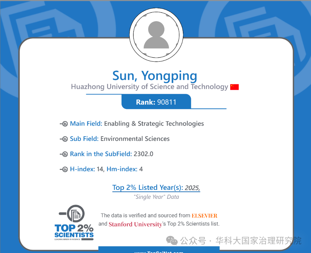 民建武汉市委会常委、华中科技大学国家治理研究院副院长、经济学院孙永平教授凭借其在环境科学与能源政策交叉研究领域的贡献成功入选“年度科学影响力榜单”。在236313位全球前2%顶尖科学家中,排名第90811位,在环境科学子领域全球130223名科学家中排名第2302位。