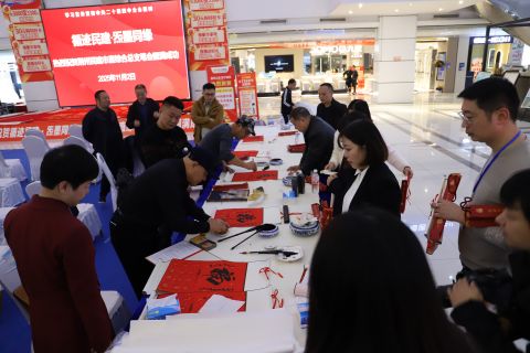书画笔会作为本次活动的重要环节,现场气氛热烈、墨香满堂。中国美术家协会会员、荆州市美协主席郑启雄,中国书画家协会理事石人国,民建中央画院院士、荆州市青年书协主席毕云扬等书画名家齐聚一堂,现场挥毫泼墨,围绕“企业发展”“实干精神”等主题即兴创作,一幅幅佳作跃然纸上。与会成员也纷纷提笔参与,在宣纸间交流心得、共绘情怀。