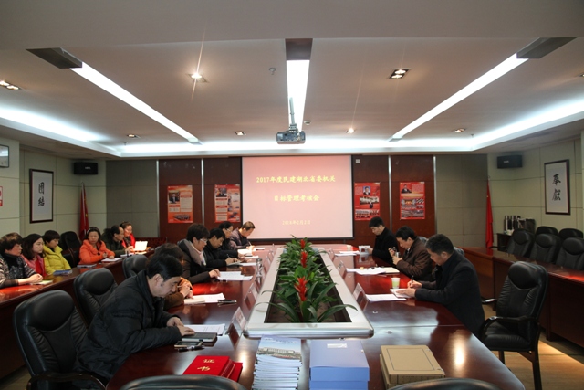 2018年2月2日上午,省委统战部常务副部长柳望春同志率队莅临省委会机关,开展2017年度目标管理考核工作。宋君慧副主委主持了考核工作会,并代表省委会机关做了述职述廉。机关全体干部职工参加了会议,并就机关社会治安综合治理、法治湖北建设绩效工作、专职副主委年度考核进行了民主测评。会后,省委统战部考核组对省委会机关的工作台账进行了查阅,并对工作表示肯定。