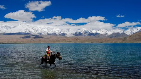 【作品简介】摄于地处帕米尔高原的公格尔雪山脚下的卡拉库勒湖畔,高原民族柯尔克孜族少年面色黝黑,英俊潇洒,骑着骏马奔驰在湖岸浅滩,马蹄溅起一片水花。