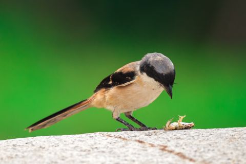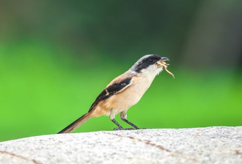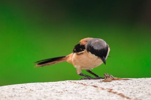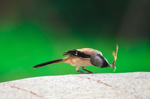作品为作者在武汉市东湖湿地偶遇一只棕背伯劳与一只青蛙在一块大石头上对峙,正好用镜头记录下伯劳与青蛙从对峙、掀翻、摔打、叼起、生吞到食毕这大自然弱肉强食惊心动魄的瞬间。该组照曾在《中国摄影报》刊登,也曾在国内外摄影赛事中获奖。