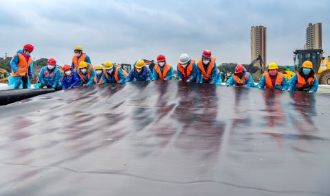 1月26日,火神山医院HDPE膜铺设